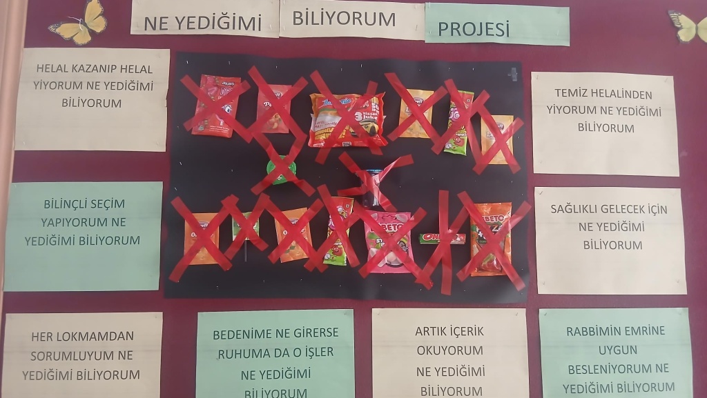 Çedes Çevreme Duyarlıyım Değerlerime Sahip Çıkıyorum Projesi ve Değerler Eğitimi kulubü kapsamında öğrencilerimizi ne yedikleri konusunda bilinçlendirmek amacıyla "NE YEDİĞİMİ BİLİYORUM"adında bir proje düzenledik. Öğrencilerimizin zararlı gördüğü yiyeceklerden, paketli gıdalardan birer tane okula getirmelerini rica ettik. Hep birlikte getirilen yiyeceklerin içerik bölümlerini okuduk ve onları pano olarak hazırlayıp bütün öğrencilerin görmesini sağladık. Duamız o ki evlatlarımızın hayatları boyunca temiz ve helal olan yiyecekler yemeleri...